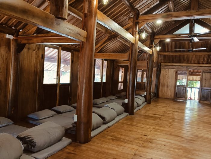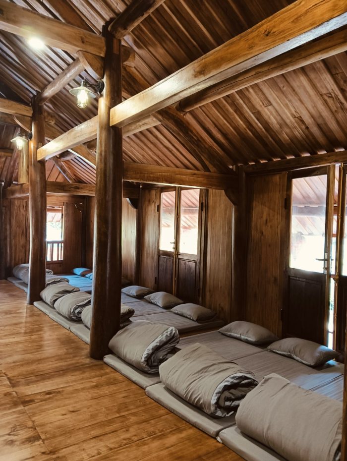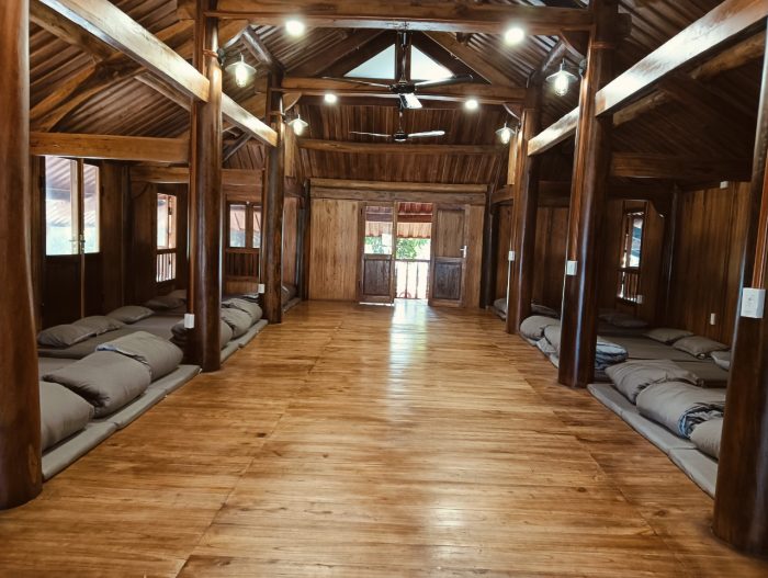 Nhà sàn cộng đồng tiêu chuẩn mỗi người một đệm, một chăn, gối. Nội thất giản dị, phù hợp với đoàn đông người muốn ở chung trong một không gian để kết nối tinh thần yêu thương và giao lưu.