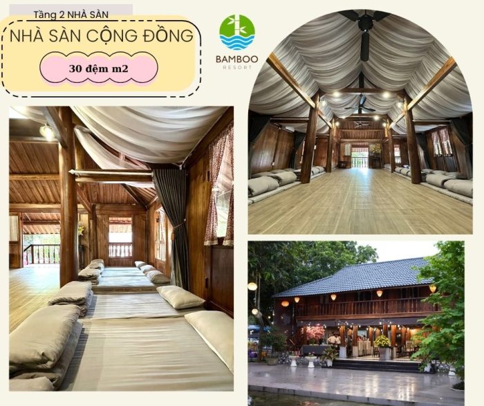 - Tổng quan: nhà sàn cộng đồng nằm ở khu tầng 2 nhà sàn, diện tích 120m², được thiết kế sang trọng và hiện đại. Mặt sàn phù hợp sắp xếp 30 đệm m2 xếp liền, phù hợp cho đoàn từ 30-40 khách.