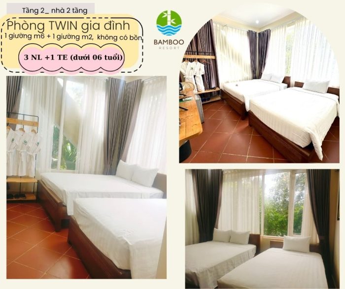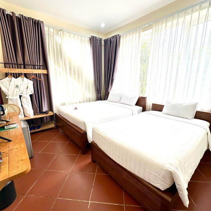 27/04/2025Phòng Twin bed room nằm ở tầng 2 của tòa nhà 2 tầng, mỗi phòng có 1 giường m6 và 1 giường đơ, phù hợp cho gia đình hoặc bạn bè đi cùng nhau. Với nội thất được thiết kế sang trọng, sạch sẽ thì đây là kiểu phòng được rất nhiều khách yêu thích.